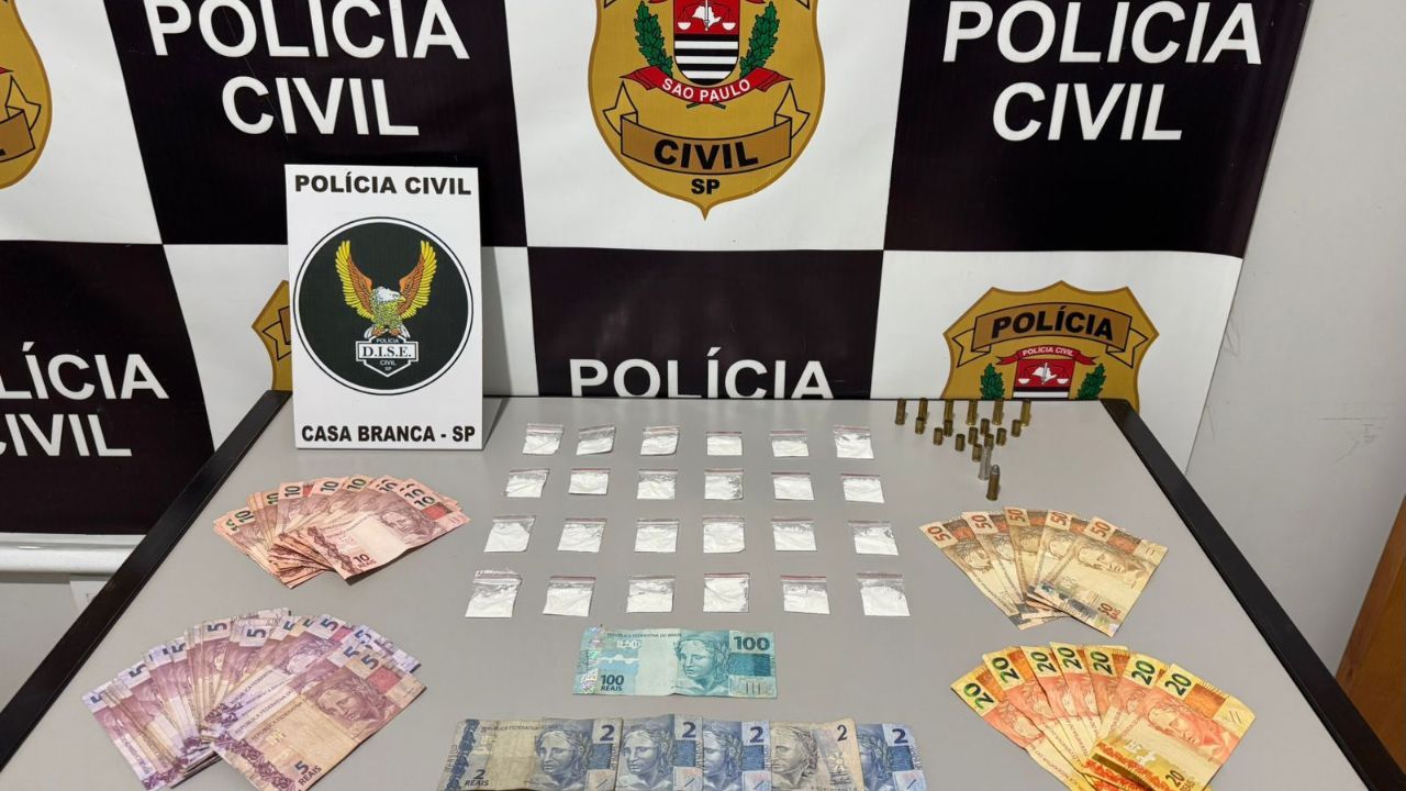 Diante dos fatos, foi dada voz de prisão em flagrante ao comerciante pelos crimes de tráfico de drogas e posse ilegal de munição. Ele foi conduzido à base da DIG/DISE em Casa Branca, onde permaneceu à disposição da Justiça.