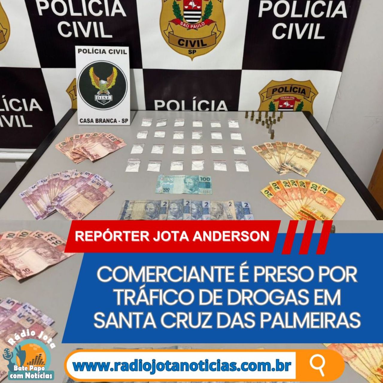 No início da noite da última quarta-feira (22), agentes da Delegacia de Investigações Sobre Entorpecentes (DISE) de Casa Branca prenderam em flagrante um comerciante de 51 anos acusado de envolvimento com o tráfico de drogas na região central de Santa Cruz das Palmeiras.