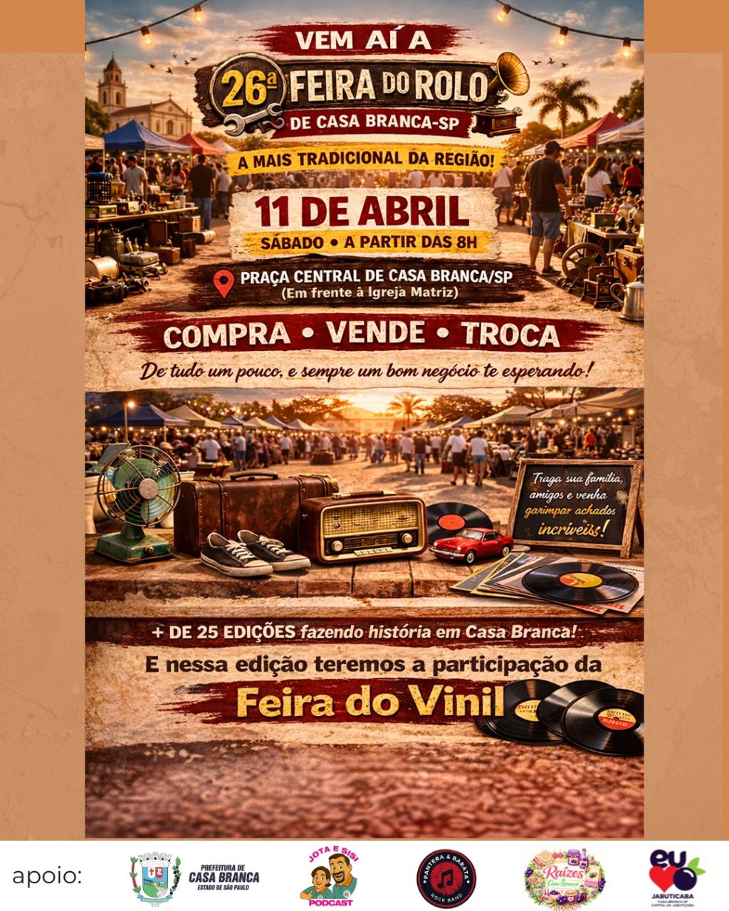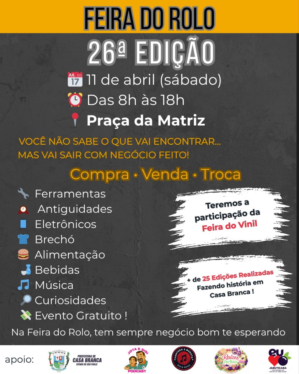 A tradicional Feira do Rolo realiza sua 26ª edição no próximo sábado, dia 11 de abril, na Praça da Matriz, em Casa Branca. O evento acontece das 8h às 18h e promete reunir moradores e visitantes em mais um dia de oportunidades, negócios e entretenimento.