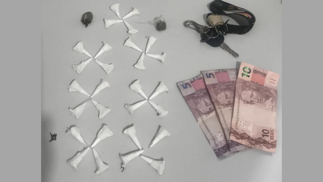 Na busca pessoal, foram encontrados R$ 100 em dinheiro. Já no interior do veículo, os policiais localizaram duas porções de maconha e mais R$ 20. Em diligência posterior, a equipe retornou ao ponto onde a sacola havia sido descartada, encontrando 28 microtubos (eppendorfs) contendo substância análoga à cocaína.