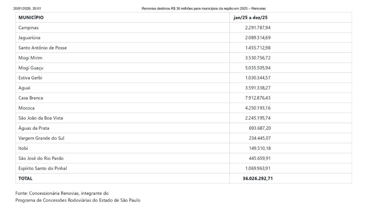Os municípios atendidos pela malha viária da Renovias receberam, ao longo de 2025, R$ 36,0 milhões em repasses referentes ao Imposto Sobre Serviços de Qualquer Natureza (ISSQN). Os recursos reforçam a arrecadação das administrações municipais e ampliam a capacidade de investimento em infraestrutura urbana e em áreas prioritárias definidas por cada cidade.