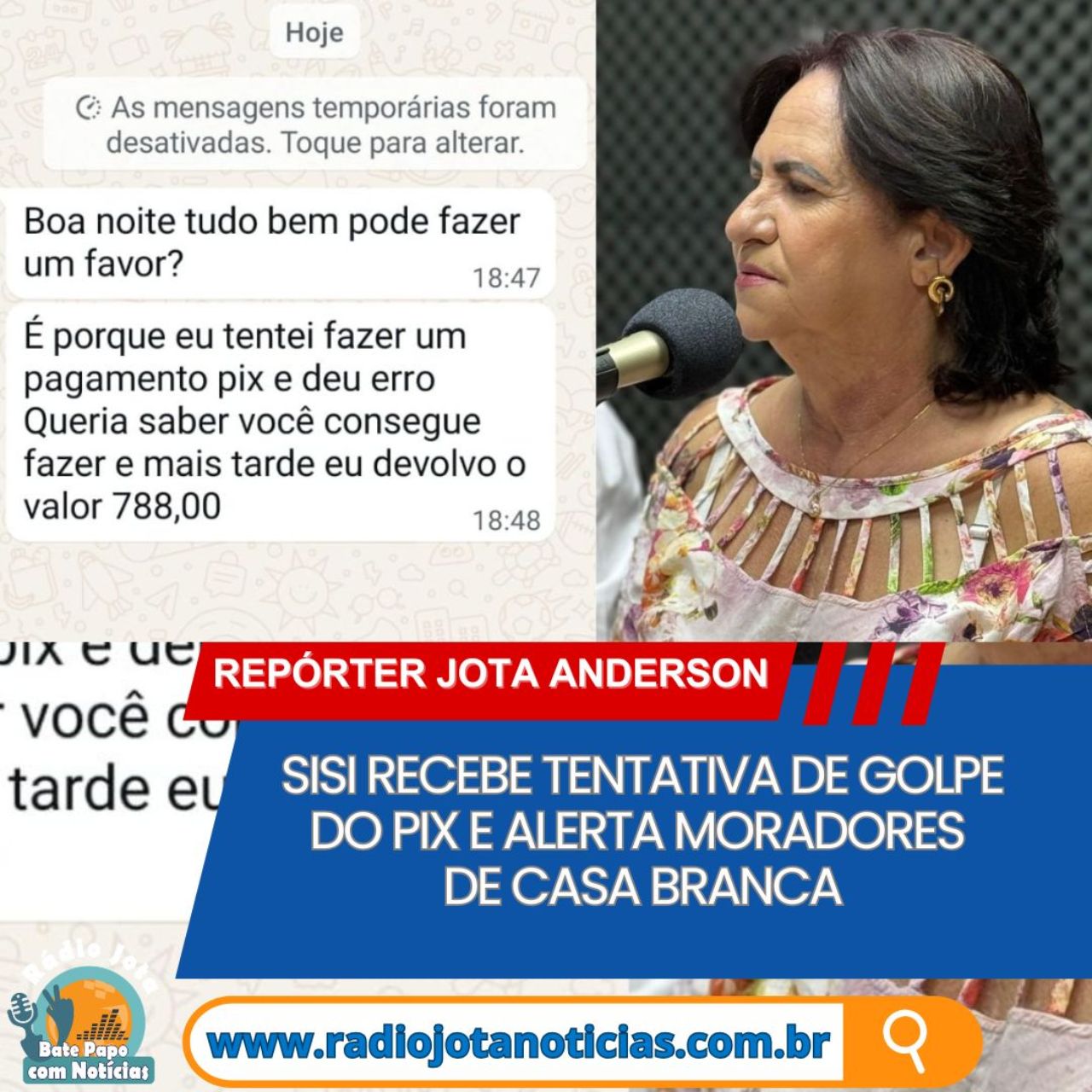 Nestaquinta-feira (16), antes de iniciar mais um episódio a Sisi, integrante do Podcast Bate Papo, da Rádio Jota Notícias, recebeu uma mensagem suspeita de um número desconhecido. O golpista se passou por alguém que acompanha o trabalho dela e tentou aplicar o golpe pedindo dinheiro.